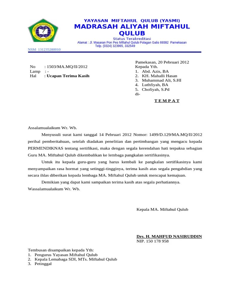 Ibu/bapak kepala sekolah sma lukman jayanto sejati muliasari no.